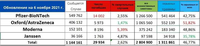 База данных Европейского Союза о подозреваемых реакциях на лекарственные средства — EudraVigilance, и в настоящее время они сообщают о 29 934 смертельных случаев и 2 804 900 побочных эффектов в результате инъекций COVID-19.