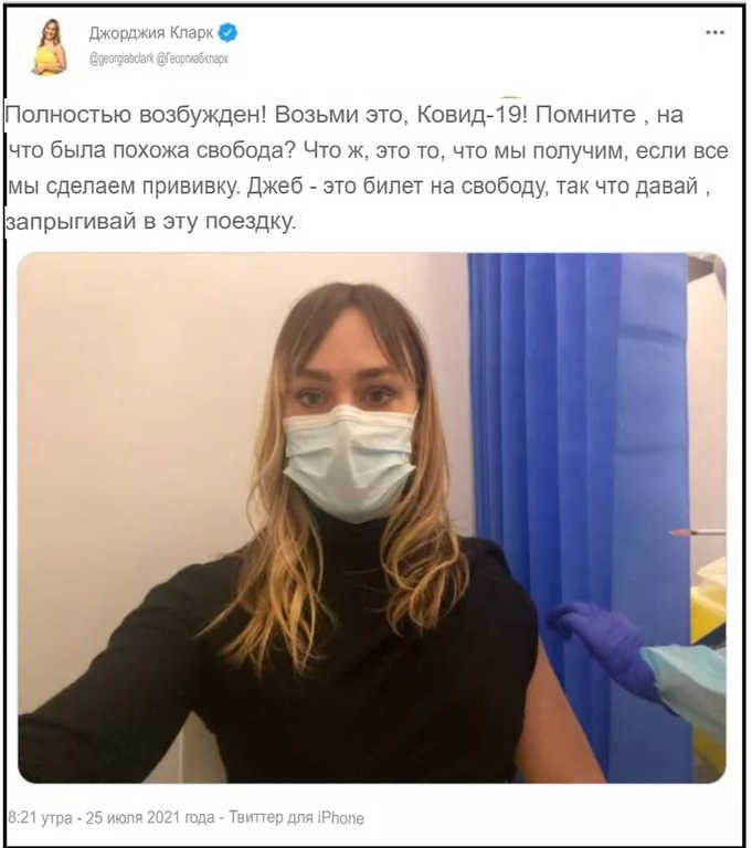 Джорджия Кларк получила свою первую прививку от Pfizer 3 июля.