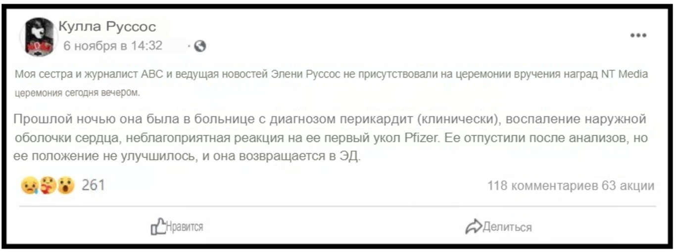 ДАРВИН — У третьего австралийского журналиста развился перикардит (воспаление сердца) после ее первой вакцины Pfizer COVID-19. Элени Руссос, журналист ABC News и ведущая редакции Darwin ABC, была госпитализирована 5 ноября, и ее сестре Кулле Руссос поставили диагноз перикардит.
