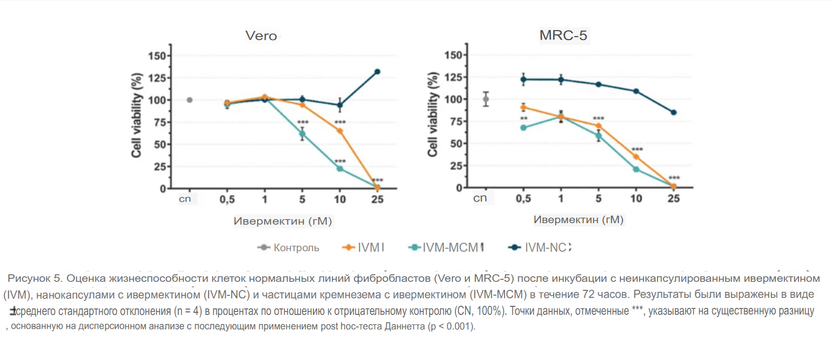 Напротив, не содержащие наночастиц (свободные) ивермектин и наночастицы диоксида кремния в более высоких концентрациях вызывали раздражение тканей и гибель клеток.